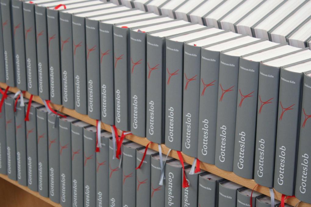 Zwei volle Regalbretter mit Ausgaben des "neuen" Gotteslobs, dem gemeinsamen Gebets- und Gesangbuch der katholischen Bistümer in Deutschland, Österreich und Südtirol.
