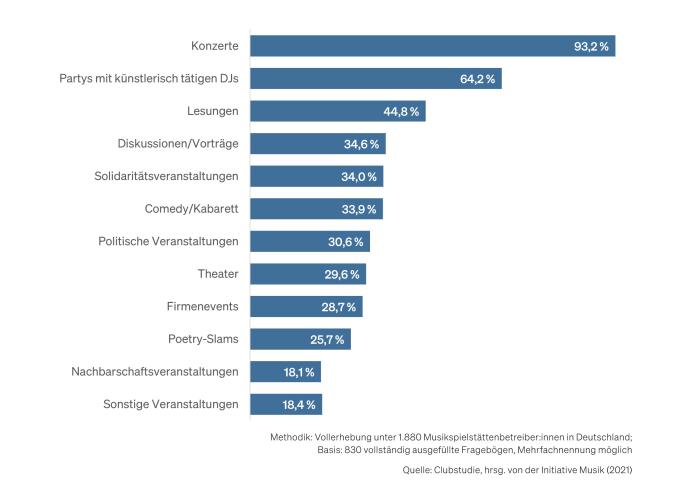Ist das Programm der Spielstätten in seiner konkreten Ausgestaltung oft sehr unterschiedlich, so zeigt sich mit Blick auf die Art der Veranstaltungen ein eher einheitliches Bild. Wie aus den Befragungen für die Clubstudie hervorgeht, finden in den Spielstätten primär Konzerte (93,2 Prozent) und/oder Partys mit „künstlerisch tätigen DJs“ statt. Auch Lesungen (44,8 Prozent) sind ein beliebtes Format. Mit Anteilen zwischen einem Viertel und einem Drittel werden auch Diskussionen/Vorträge, Comedy/Kabarett, Theater, Poetry-Slams oder Firmenevents genannt. [21]