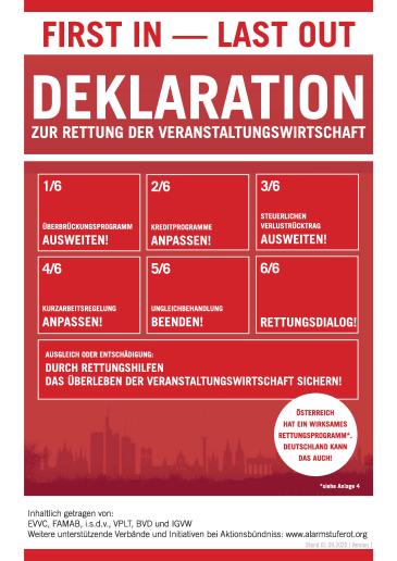 Initiativen und Verbände der deutschen Veranstaltungswirtschaft haben sich in dem Bündnis #AlarmstufeRot zusammengeschlossen. Im Interesse von nahezu 10.000 Unternehmen mit mehr als 250.000 Beschäftigten stellen sie in ihrer Erklärung konkrete Forderungen an die Regierung. Ziel ist es, den Wirtschaftszweig mit 130 Mrd. Euro Umsatz sowie über 1 Mio. Beschäftigten zu retten.