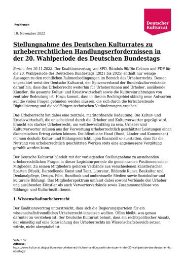 Mit Verweis auf fehlende Aussagen zu den rechtlichen Rahmenbedingungen im Bereich des Urheberrechts im Koalitionsvertrag bündelt der Kulturrat offenstehende Fragen seiner Mitglieder.
