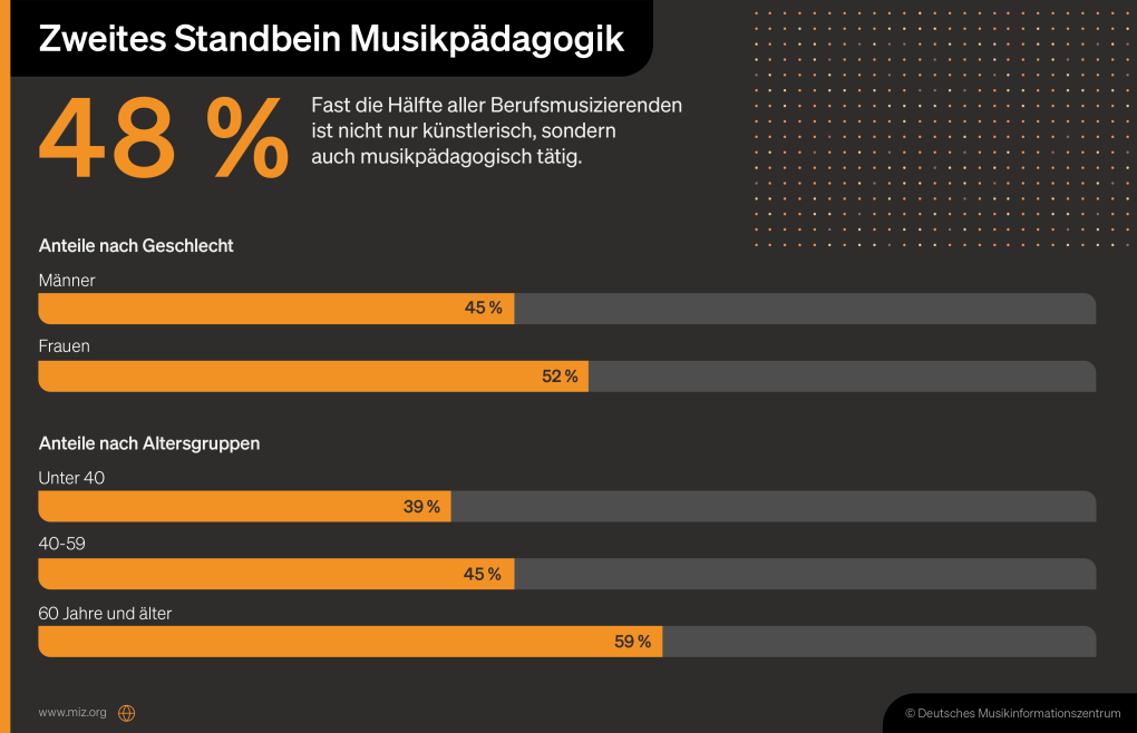 Berufliche Mosaike sind für die Mehrheit der Berufsmusizierenden eher Normalität als Ausnahme: Nur 30 Prozent sind ausschließlich musikalisch-künstlerisch tätig, 70 Prozent der professionellen Musiker*innen gehen zusätzlich musikpädagogischen und/oder nicht-musikalischen Tätigkeiten nach, um ihren Lebensunterhalt zu bestreiten. Besonders musikpädagogische Tätigkeiten spielen für viele professionelle Musiker*innen eine große Rolle: Fast jede*r Zweite ist neben der Berufsmusik noch musikpädagogisch aktiv, besonders häufig Frauen und ältere Berufsmusizierende im Alter von über 60 Jahren.