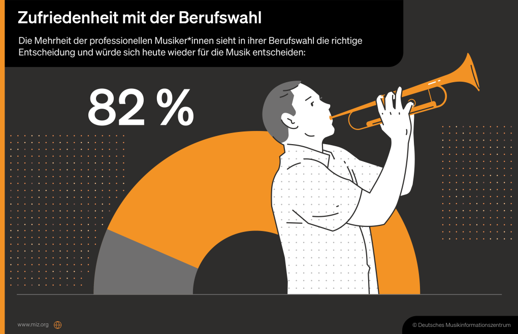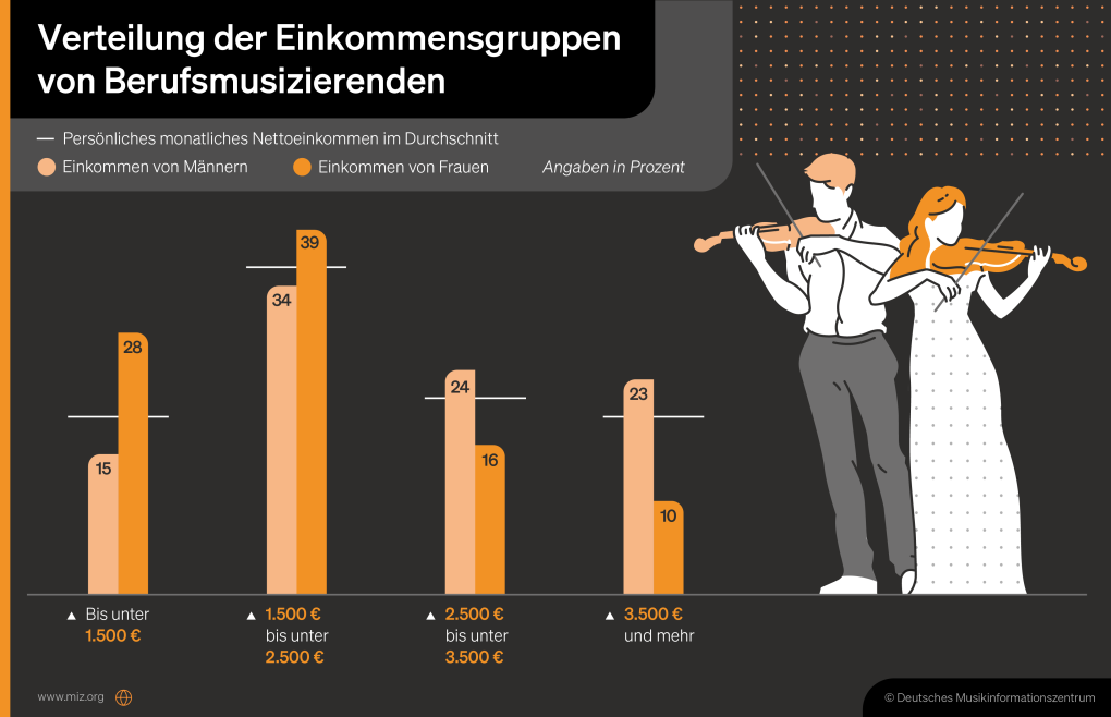 Das monatliche Nettoeinkommen der Berufsmusiker*innen in Deutschland liegt im Schnitt bei 2.660 Euro, allerdings verdient jede*r Fünfte weniger als 1.500 Euro pro Monat. Der mit Abstand größte Anteil der Einnahmen von Berufsmusizierenden stammt aus musikalischen Tätigkeiten: 62 Prozent aller Einkünfte erzielen Berufsmusizierende, indem sie professionell Musik machen. Dazu gehören neben Gehältern und Honoraren auch Einkünfte aus Studioaufnahmen, künstlerischen Projekten, Tonträgerverkäufen, Merchandising oder Ausschüttungen von Verwertungsgesellschaften. 17 Prozent der Einkünfte stammen zusätzlich aus musikpädagogischen Tätigkeiten und 15 Prozent aus beruflichen Tätigkeiten, die nichts mit Musik zu tun haben.