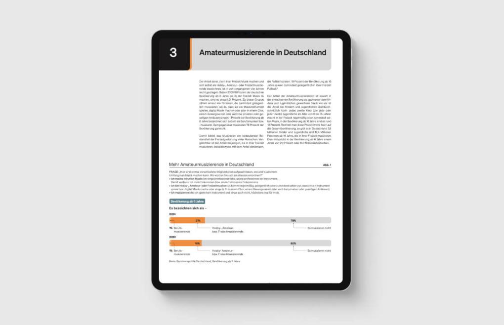 21 Prozent der deutschen Bevölkerung ab 6 Jahre musizieren in ihrer Freizeit – das sind rund 16,3 Millionen Menschen und etwa 2 Millionen mehr als noch vor vier Jahren. Die Studie „Amateurmusizieren in Deutschland“ bietet einen differenzierten Überblick über Altersgruppen, geschlechts- und schichtspezifische Unterschiede sowie über Zugangswege, Herausforderungen und das ehrenamtliche Engagement der Musizierenden.