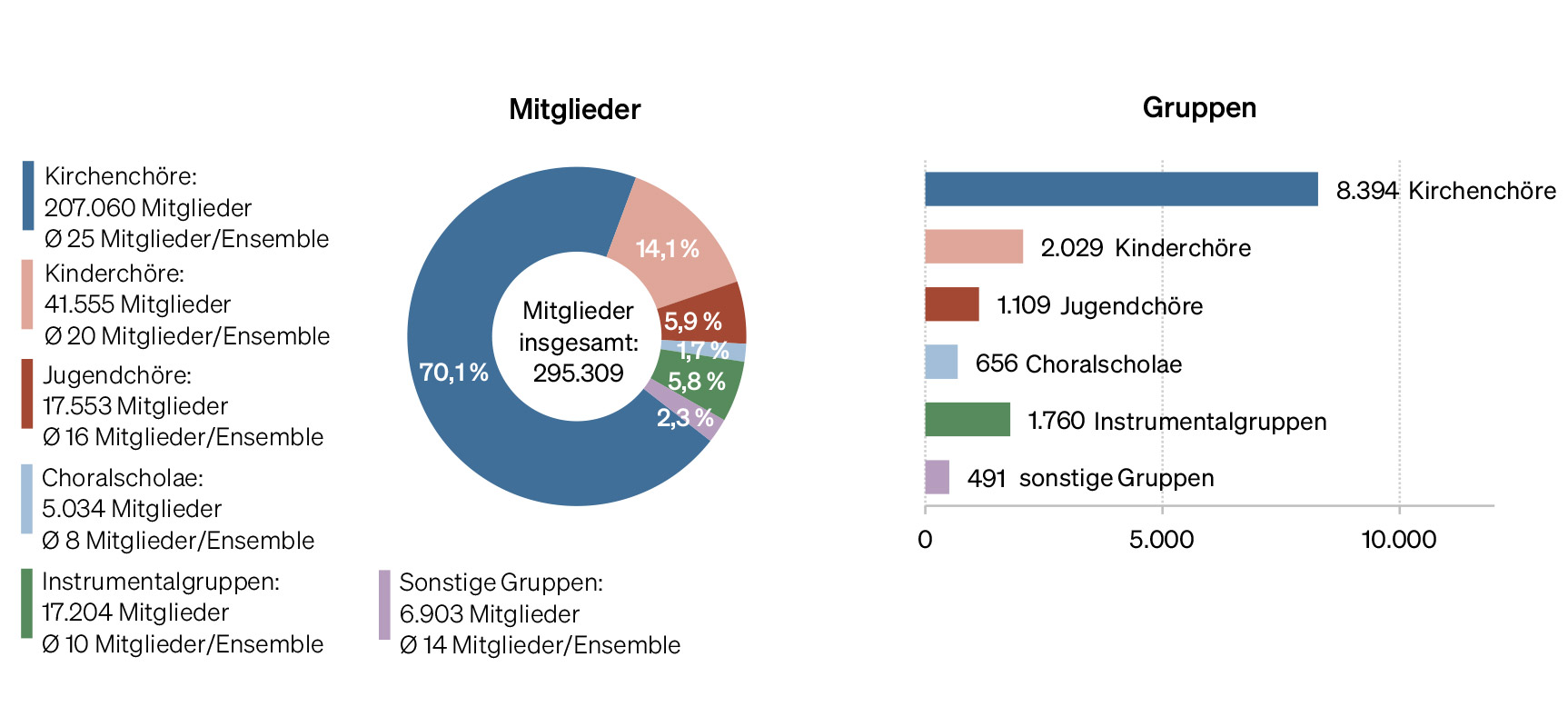 Insgesamt 14.439 Ensembles waren 2023 in der Katholischen Kirche organisiert, davon mehr als die Hälfe Kirchenchöre (8.394) sowie mehr als ein Fünftel Kinder- und Jugendchöre (zusammen 3.138).