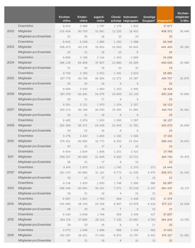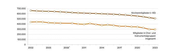 In den vergangenen zehn Jahren betrug der Rückgang der Mitgliederzahlen in den Chören und Instrumentalgruppen rund 25 % und war damit stärker ausgeprägt als die rückläufige Entwicklung der Kirchenmitgliederzahlen (-16 %).