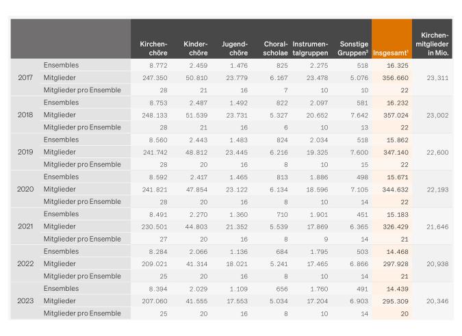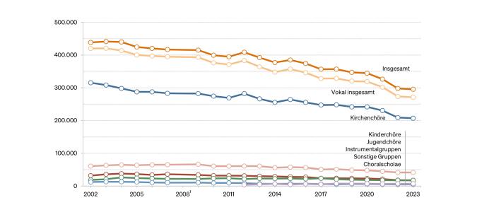 Insgesamt ist die Zahl der Amateurmusizierenden in der katholischen Kirche in den letzten zwei Jahrzehnten rückläufig gewesen. In den Jahren 2002 bis 2004 waren es ca. 440.000, 2010 bis 2013 rund 400.000, im Jahr 2019 wurde der Wert von 350.000 unterschritten. Seither hat die katholische Kirche rund 49.000 Sänger:innen sowie rund 2.800 Musiker:innen in den Instrumental- und sonstigen Gruppen verloren. Die Zahl der Ensembles in der katholischen Kirche war seit 2019 um insgesamt rund 1.400 rückläufig. Vor allem Chöre und Choralscholae (insgesamt 1.122) haben sich seither aufgelöst. Lediglich gegenüber dem Vorjahr 2022 blieben die Zahlen zuletzt stabil.