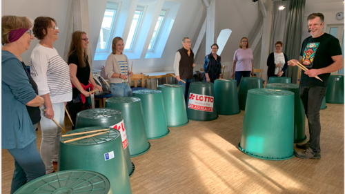 Trommeln auf Regentonnen? Das klingt für manchen erstmal merkwürdig - ist aber seit Jahren deutschlandweit bekannt und macht viel Spaß. Auch ohne musikalische Vorbildung kann man hier mit einfachsten Mitteln von Null auf Hundert durchstarten. Es werden zuerst leichte, dann zunehmend schwierigere Rhythmen erarbeitet, die dann auch sehr schnell in zweistimmiger Form zu einem oder auch mehreren Stücken entwickelt werden. Jeder kann in kurzer Zeit erstaunlich komplexe Trommelgrooves lernen, die der Musik innewohnende Faszination spüren und dabei Abschalten und vollkommen im Hier und Jetzt sein.